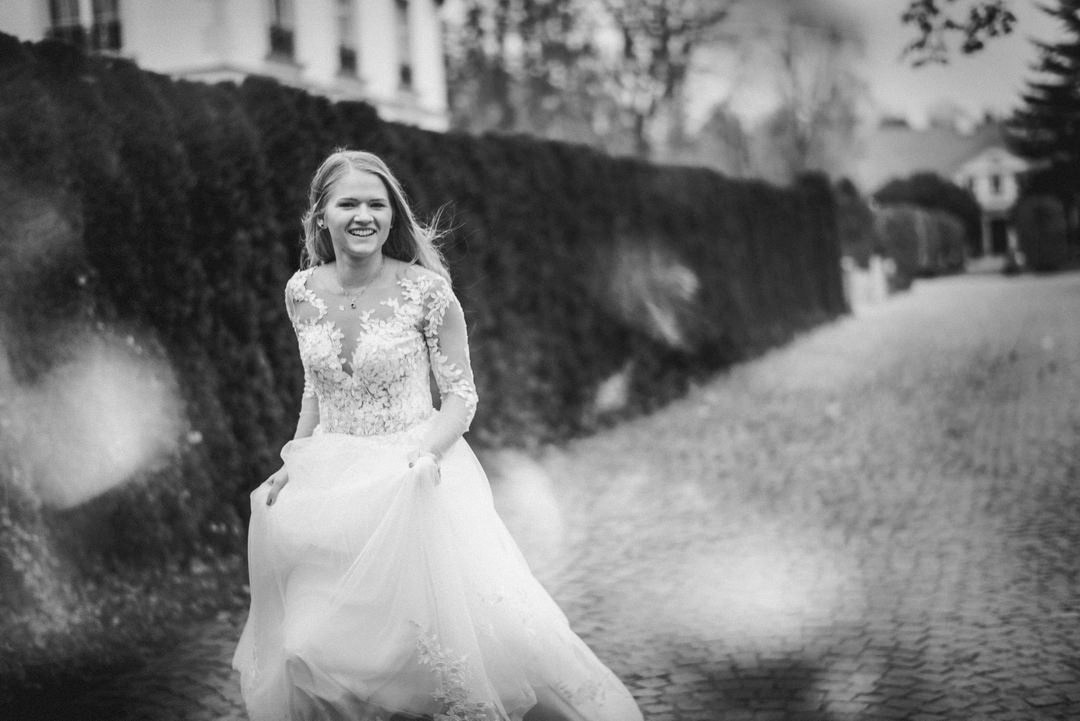 uśmiechnięta panna młoda, zdjęcia panny młodej w parku, plener ślubny gdańsk, park